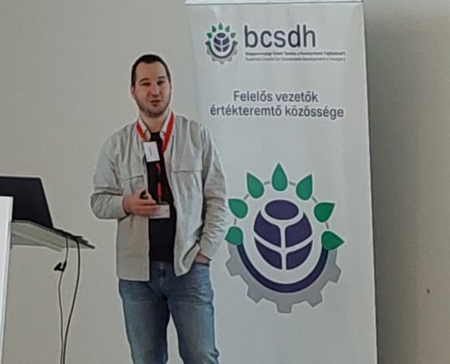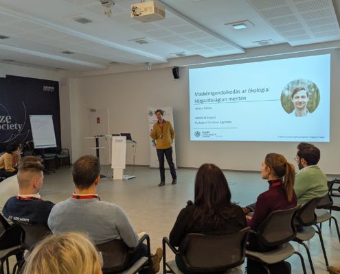 A nap utolsó előadásában Veress Tamás, a Budapesti Corvinus Egyetem Gazdaságetikai Intézetének oktatója és kutatója beszélt arról, hogy kevés kétség van afelől, hogy a jelenlegi ökológiai válságból nem tudjuk ki „gazdaságnövekedni” magunkat. Különbség van a profit maximalizálás és a profitszemlélet között. A profitszemlélet kell az inspiráció, motiváció fenntartásához, de törekedni kell a zéró összegű játszmák helyett win-win helyzetek működtetésére. Az anyagiasságot fel kell váltani a jól-lét orientáltsággal. Ezt kell beépíteni az üzleti modellekbe és együttműködésekbe. Ezekre mutatott be inspiráló példákat, többek között arra is, hogy az értékorientáltságot hogyan lehet tovább vinni a vezetőváltás után is és milyen döntések szükségesek ahhoz, hogy ez egy multinacionális cégnél is működjön.