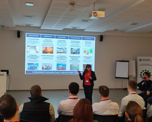 Márta Irén, a BCSDH igazgatója mutatta be a World Economic Forum 2026-os Globális kockázati indexének főbb eredményeit, majd a jelen és következő időszak kulcsfontosságú makrotrendjeiről, azokról a zavarokról, amelyekkel jelen korunkban kell megbirkóznunk beszélt. Bemutatva a BCSDH szakmai munkáját kiemelte az idei év szakmai fókuszát: a klímaadaptáció és klímareziliencia témáját.