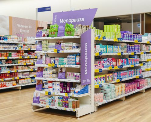 Ezen szeretne változtatni a Tesco, amelynek budaörsi, debreceni, szegedi, pécsi és győri áruházában teszt jelleggel kialakított menopauzamodulok az egészségügyi termékek környékén helyezkednek el, és a polcokon a menopauza tüneteinek nyolc területéhez kapcsolódva kínál termékeket. Ezek a vazomotoros tünetek; az alvás és regeneráció; a kognitív képességek és hangulat; az izmok, ízületek és csontok; az arc-, bőr- és szemápolás; a test- és hajápolás; a hüvelyi és húgyúti tünetek; valamint a táplálkozás és emésztés. A termékcsoportok mellett fel vannak tüntetve a legtipikusabb panaszok, a QR-kód leolvasásával pedig további információ érhető el róluk a Tesco weboldalán, valamint az online beszerezhető egyéb releváns, tünetenyhítő termékről és az életminőség javításához rendelkezésre álló további információs lehetőségekről.