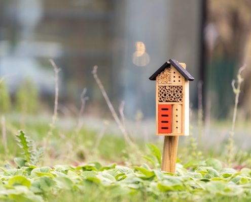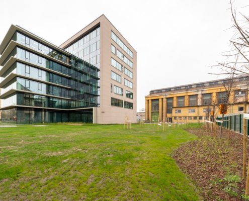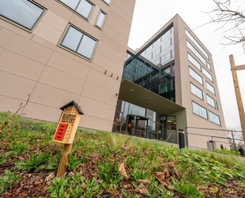 A Hengermalom úti irodaház 2 889 m²-es zöldfelülete – nagyjából fél futballpályányi terület – egy tudatosan kialakított, több szinten működő ökoszisztéma.  A kötelező 17 helyett 40 fa kapott helyet, és több mint 100 különböző növényfajt telepített a vállalat, amelyet madárodúk, rovarhotelek és süngarázsok egészítenek ki. Ez a környezet egyszerre erősíti a biodiverzitást és ad valódi használati értéket a mindennapokban. A csapadékvíz helyben hasznosul, a háromszintes, változatos növényállomány pedig árnyékoló és párologtató hatása javítja a mikroklímát, mert mérsékli a városi hősziget jelenséget. A fenntartható üzemeltetést a keletkező zöldhulladék helyben hasznosítását lehetővé tevő komposztálók, a mulcsozással történő talajvédelem és az üzemeltető számára készített részletes fenntartási kézikönyv is támogatja.